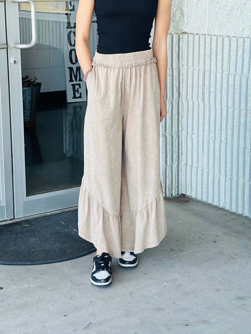 Taupe Tiered Ruffle Mineral Wash Wide Leg Pants