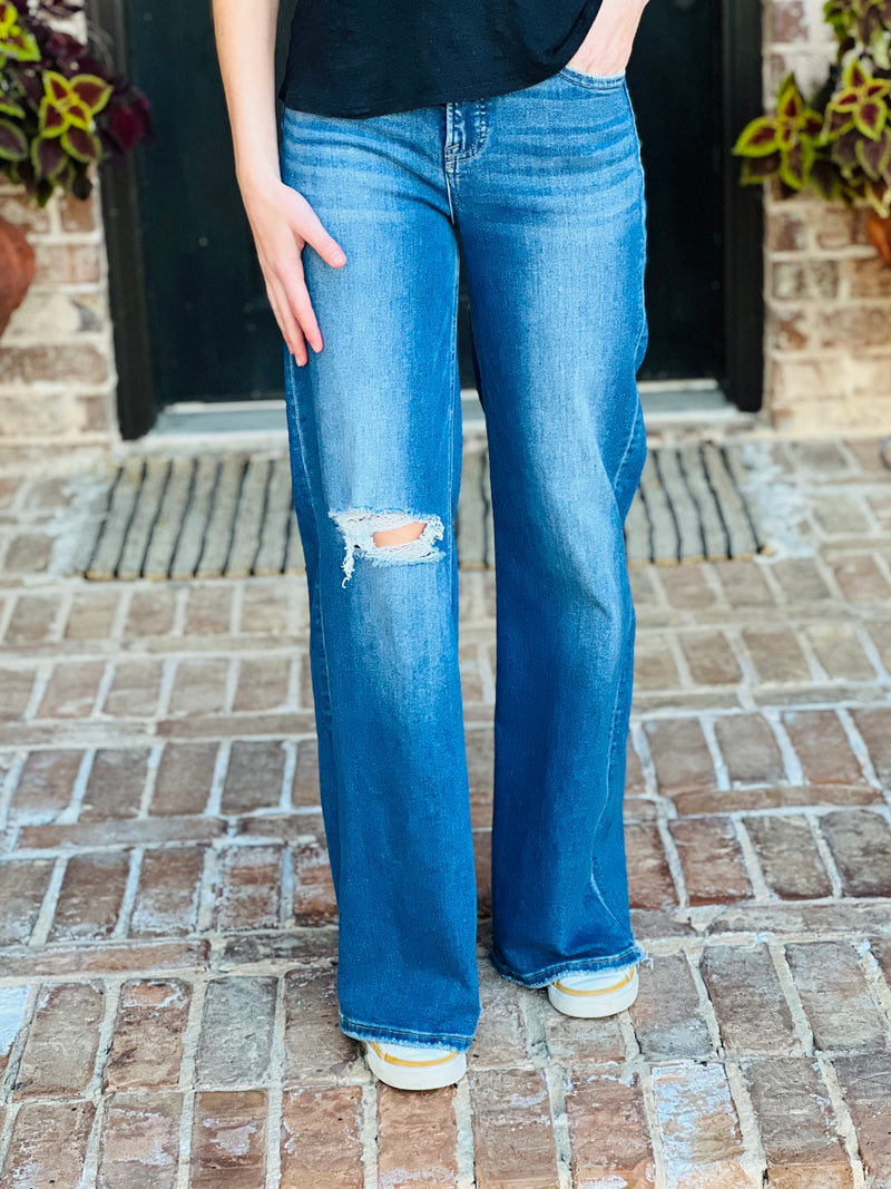 Risen | Ellie Hi Rise Wide Leg Distressed Knee Jeans