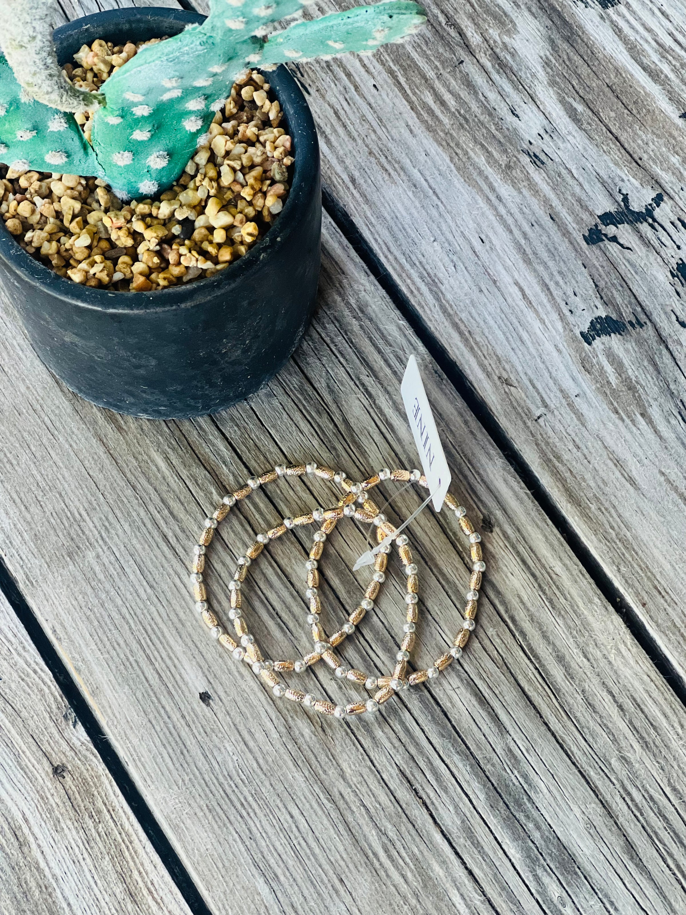 Add some flair to your wrist with our Mixed Metal Stacked Bracelet! The eclectic combination of metals creates a unique and eye-catching look. Perfect for any outfit, this bracelet is sure to make a statement (without breaking the bank)!