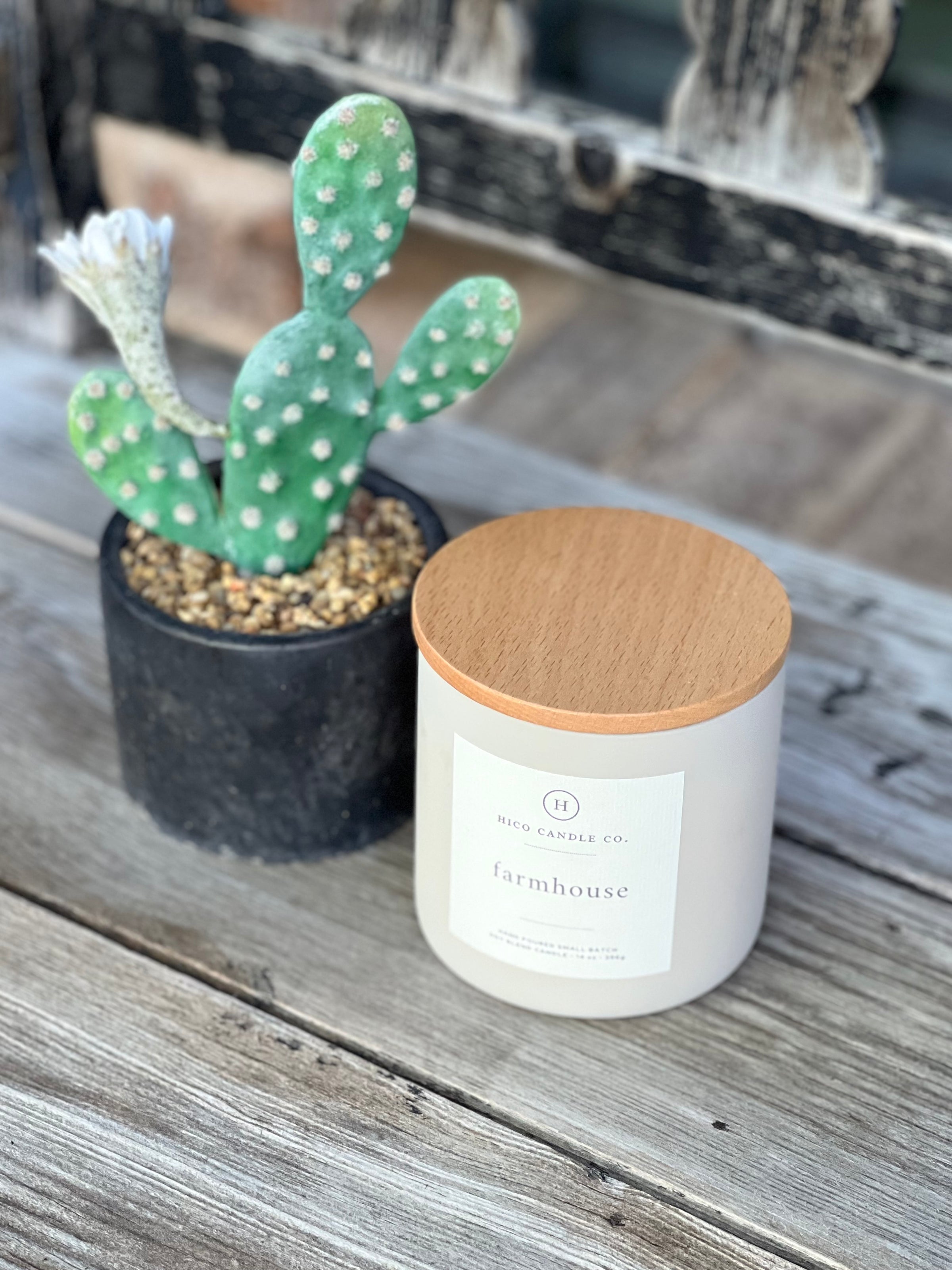 Welcome to the nostalgic aroma of Farmhouse. The scent of sweet and spicy apple pie topped with cool whip transports you to cozy, homey kitchens filled with love, warmth, and delicious homemade treats. All of our candles are hand poured using a blended soy wax and double cotton wicks.