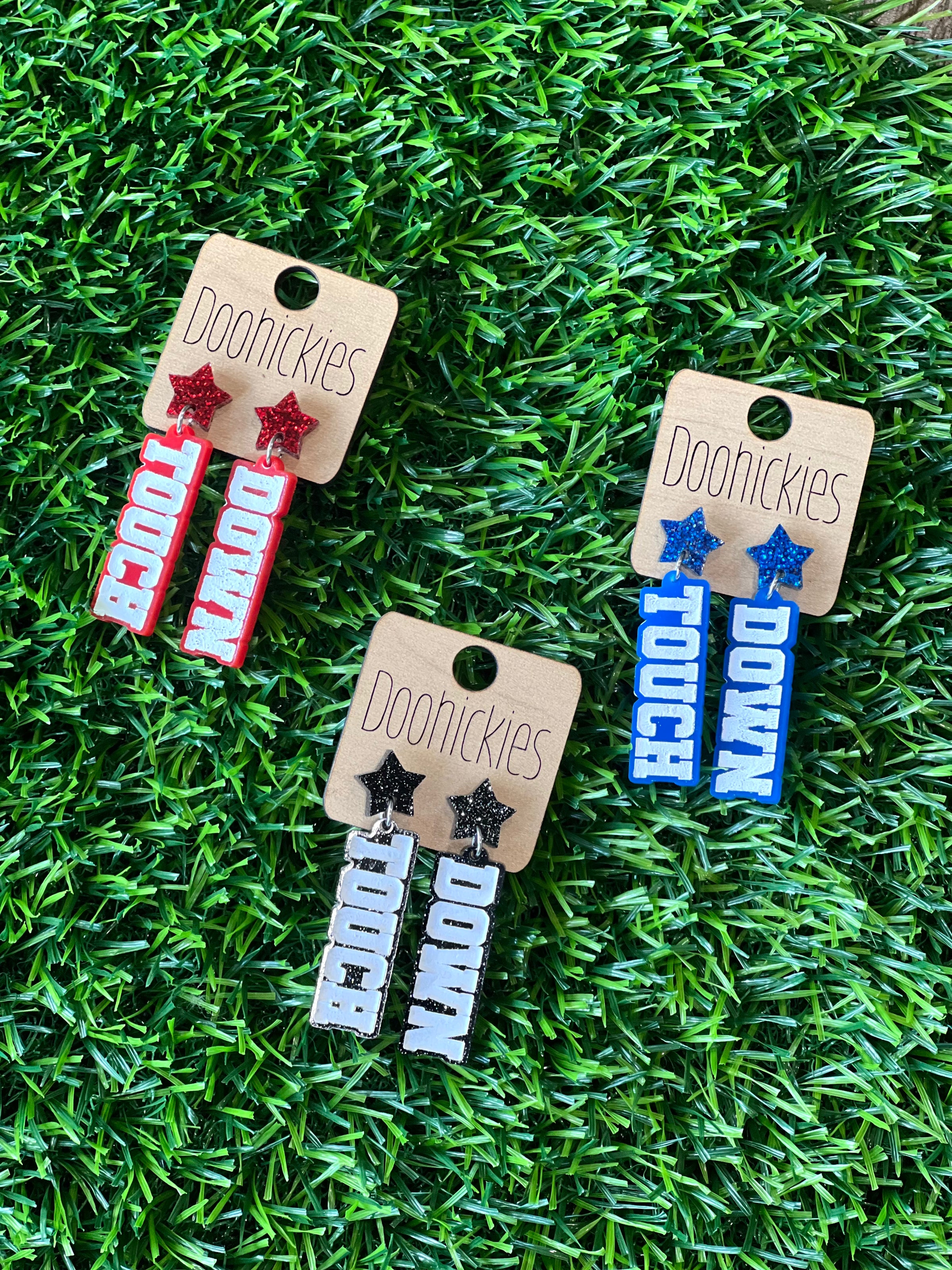 Add some extra sparkle to your school spirit with our customizable Glitter Touch Down Dangles!