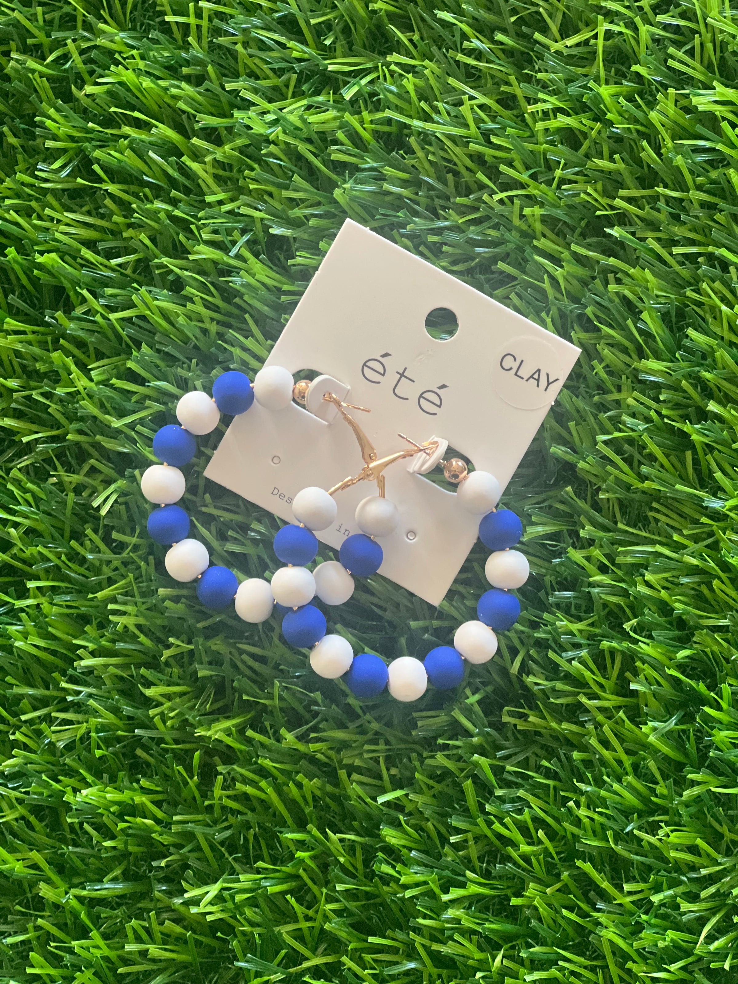 Put a spin on traditional hoop earrings with our Royal Blue Matte Clay Ball Hoops! These vibrant blue hoops are made with a unique matte clay material, adding a touch of texture to your game day look.
