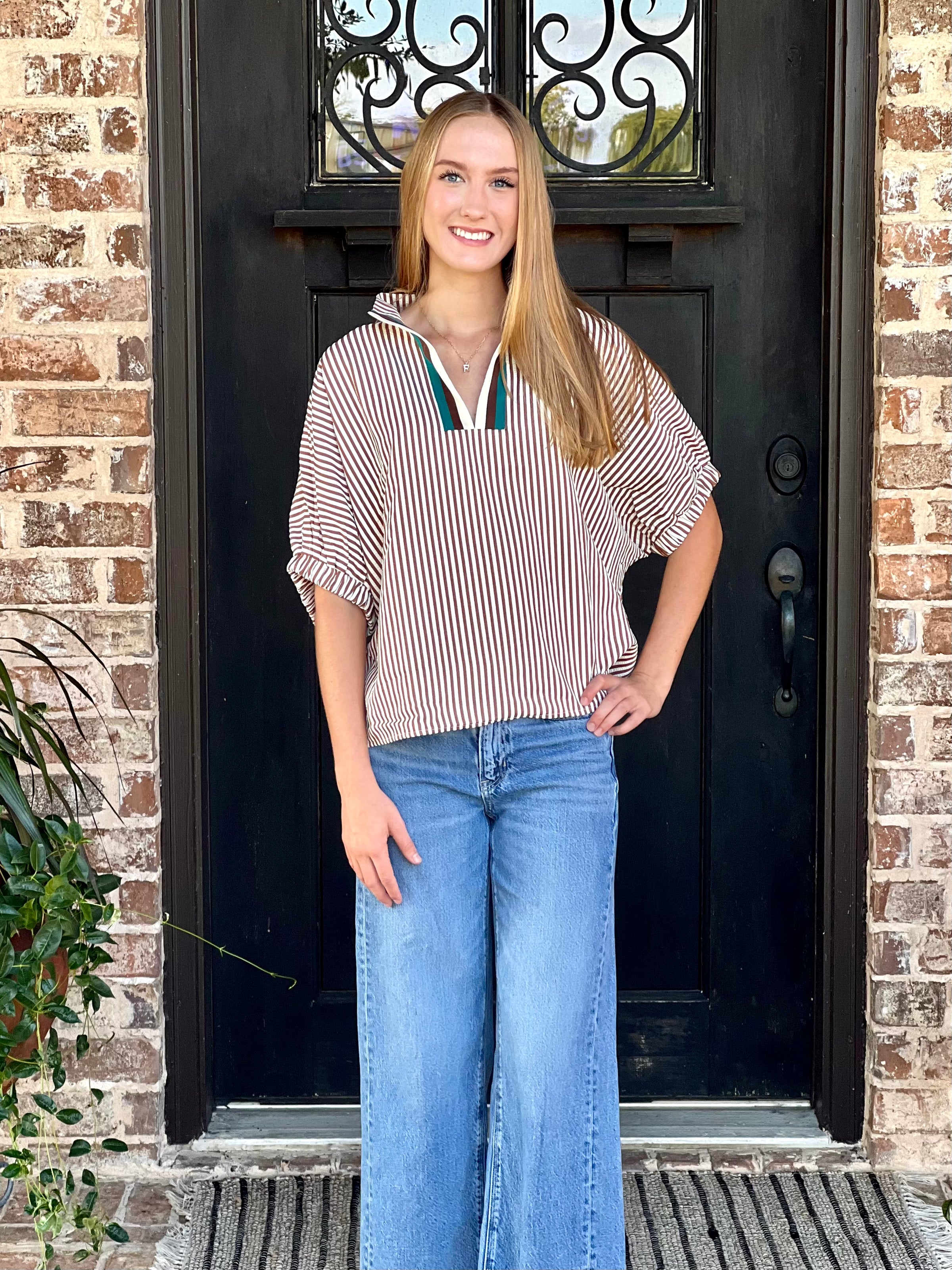 Stripe pattern high neck elasticated sleeve band dolman top featuring accented multicolor rib band split neck. Unlined. Woven. Non-sheer. Lightweight.
