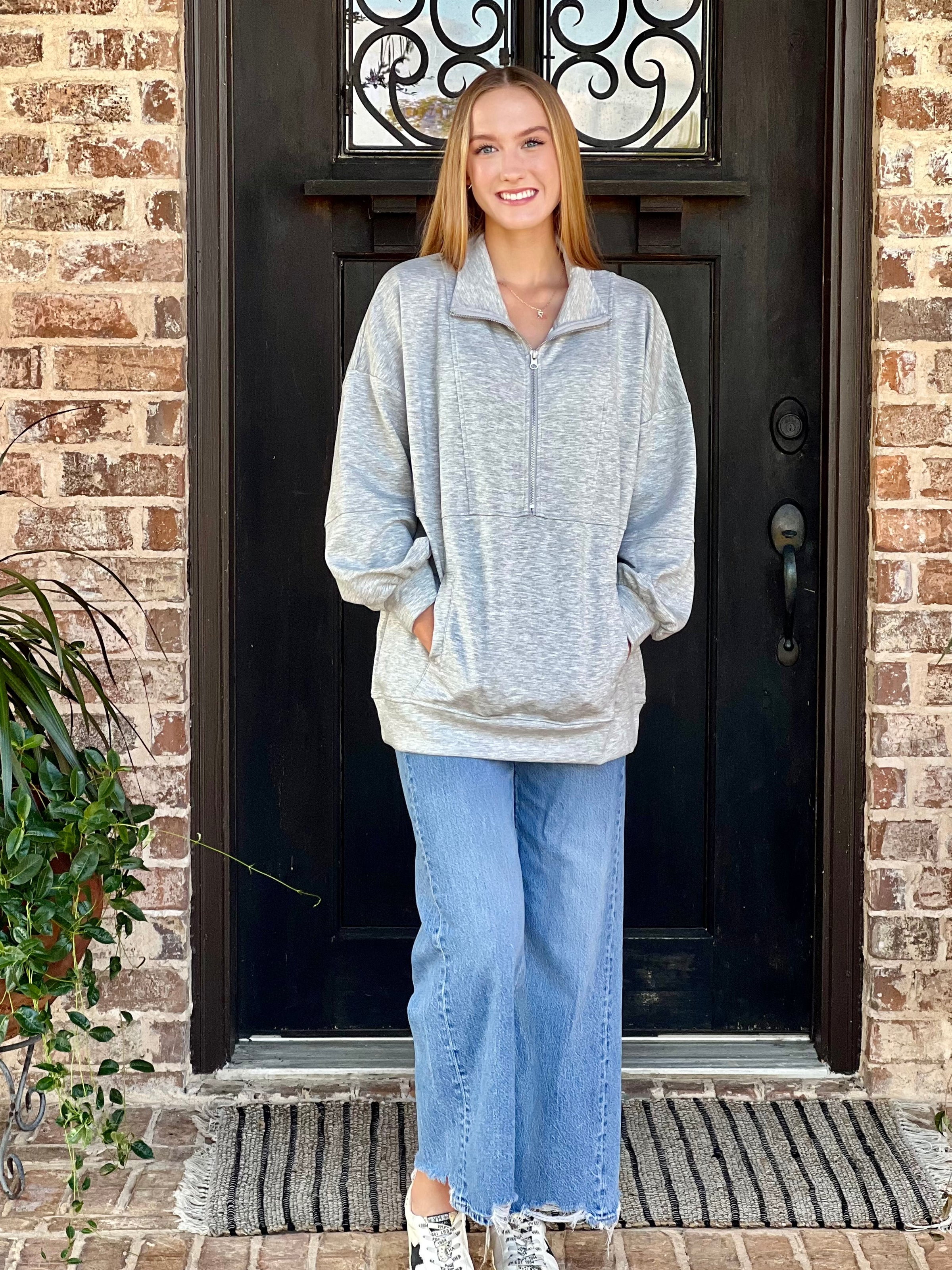 Comfort just got cuter with our Mendy Heather Grey Quarter Zip sweatshirt. This is a must to wear with denim or leggings!