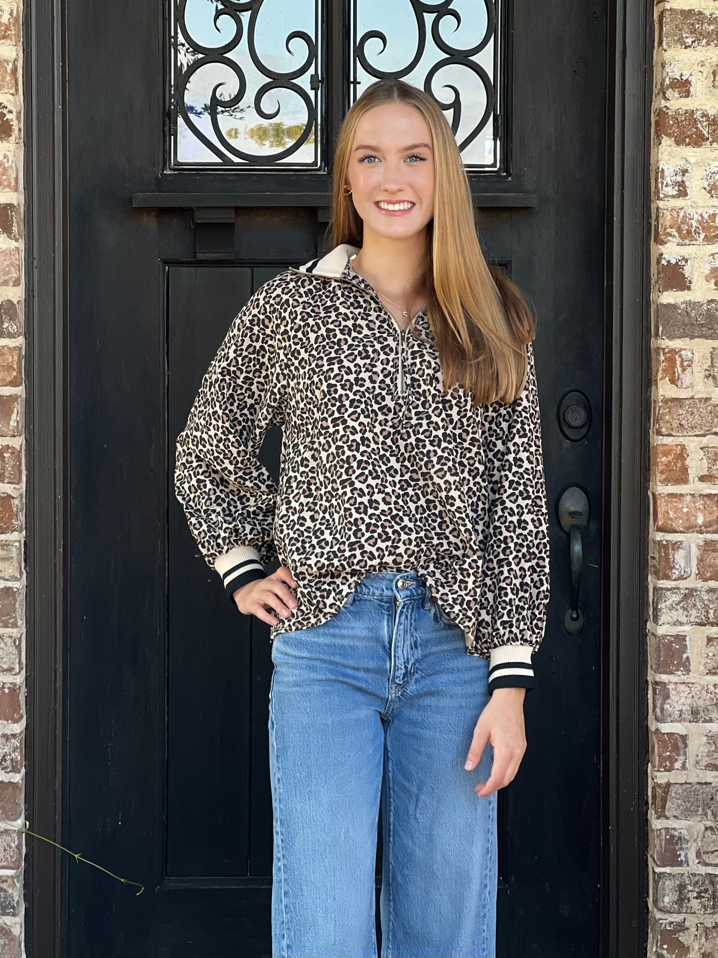Leopard long sleeve top featuring ribbed spread collar with quarter zip closure. Unlined. Woven. Non-sheer. Lightweight.