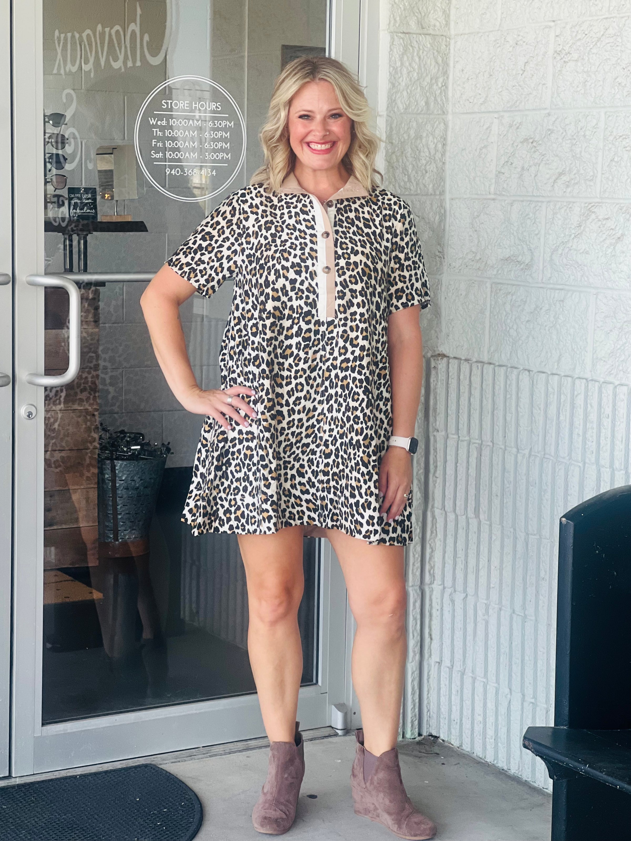 Unleash your wild side in the Wild About You Leopard Dress. This playful and fierce dress features a bold leopard print that will make you stand out in any crowd. With a flattering silhouette and comfortable fit, it's the perfect choice for any occasion. Get ready to turn heads and show off your fun and fearless style with this must-have dress!